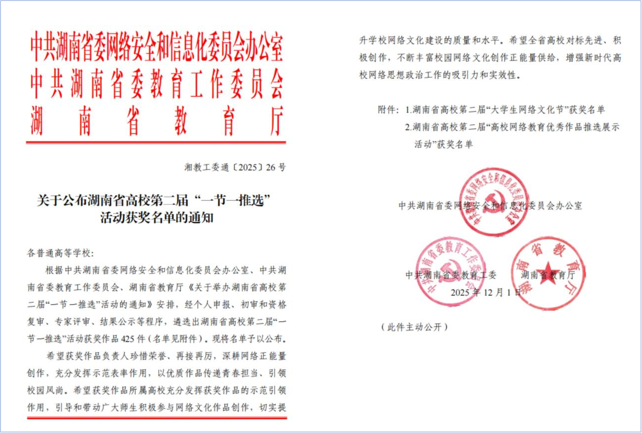 (通讯员 何楚静 王欣悦)近日,由中共湖南省委网络安全和信息化委员会办公室、中共湖南省委教育工作委员会、湖南省教育厅主办的湖南省高校第二届“一节一推选”活动作品评选结果公布,我校共20项作品成功入选。其中,“大学生网络文化节”一等奖6项、二等奖2项、三等奖3项;“高校网络教育优秀作品推选展示活动”一等奖6项、二等奖3项。
