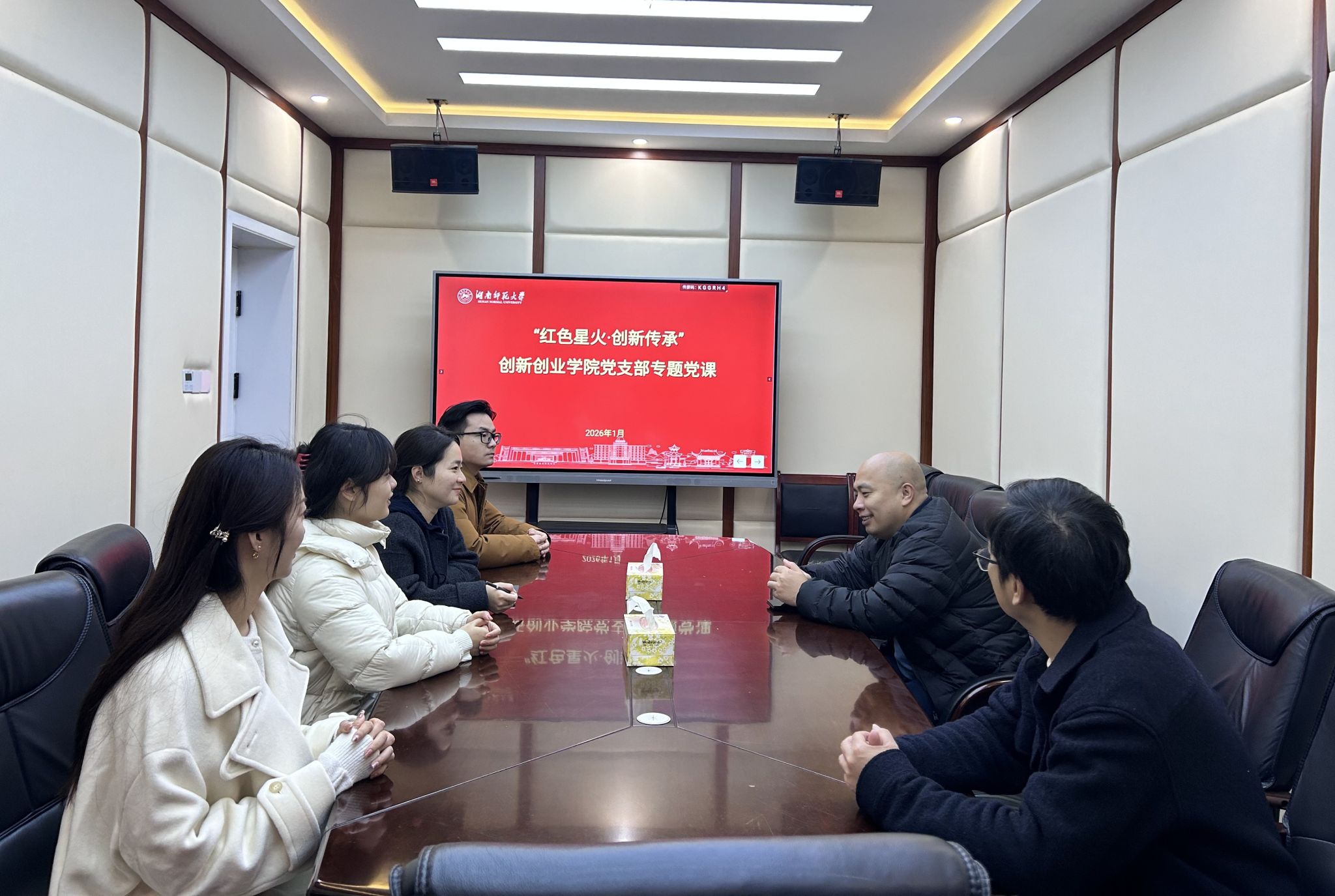 支部在陈列馆会议室召开专题学习会。支部书记朱浩浩同志讲授专题党课,以新民学会历史为主线,生动讲述了早期共产党人坚守理想、立足实践、传承精神的光辉事迹,引导党员深刻感悟“心怀天下、敢为人先”的格局与担当。与会人员结合所见所学,围绕如何将先辈精神转化为推动创新创业教育工作的实际行动进行了交流研讨。大家纷纷表示,要从党史中汲取智慧,立足本职贡献力量。