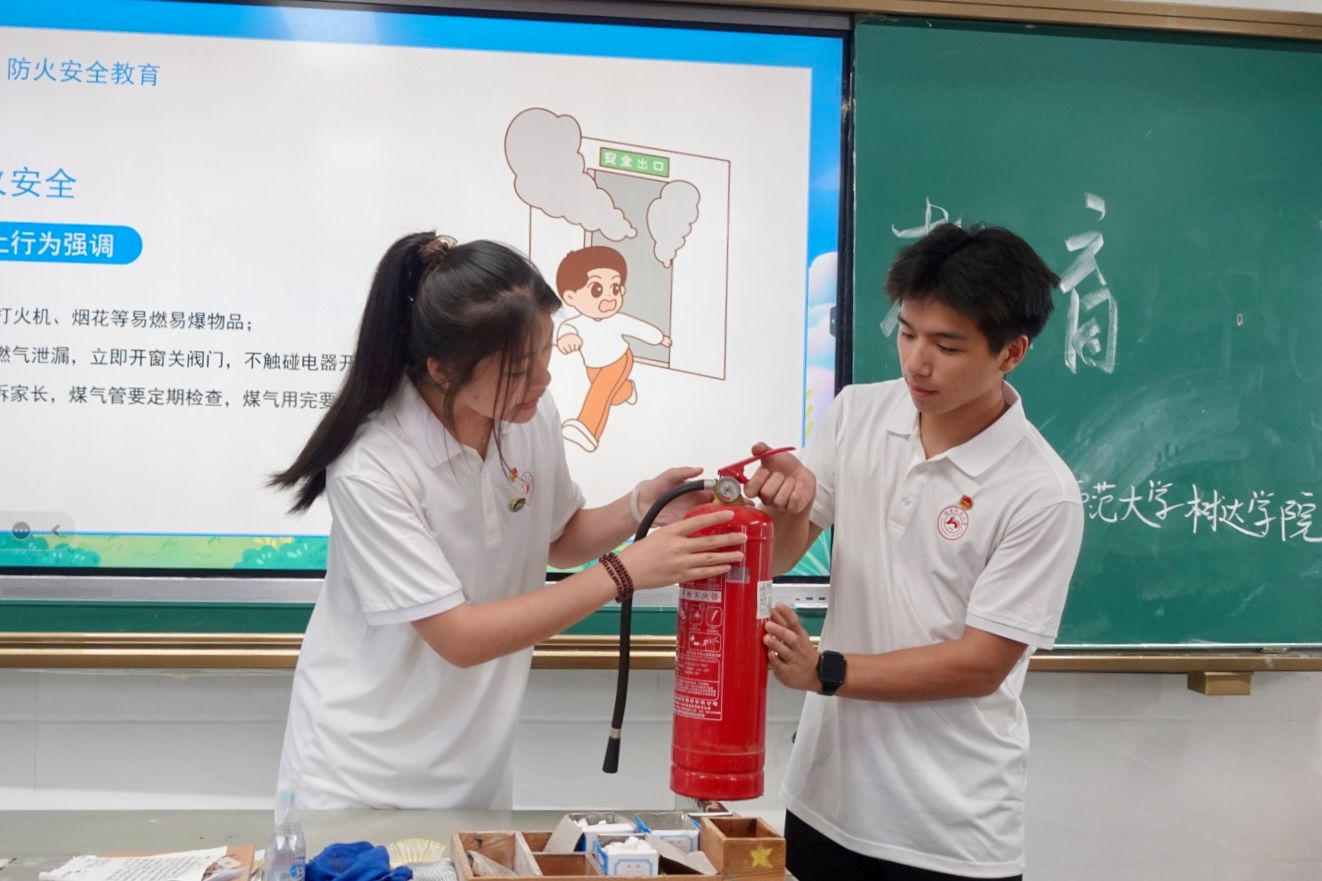 支教组成员姜澳廷、周劲翔聚焦灭火器的使用要点,进行细致讲解与现场演示,并对提握方法、喷射步骤进行分步拆解、实操示范,强化了同学们的火灾应对实操能力。