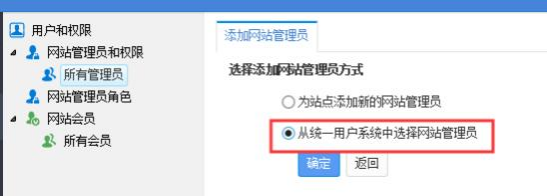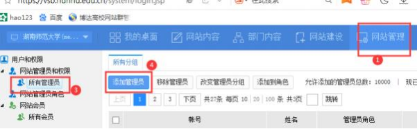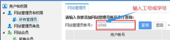 单位管员在站群平台后台中,通过“网站管理”—— “用户和权限”中的“添加管理员”—— “从统一用户系统中选择网络管理员”,输入工号或学号查找就可以添加为该网站管理员,再分配管理权。具体 操作如图 4、图 5 、图 6.
